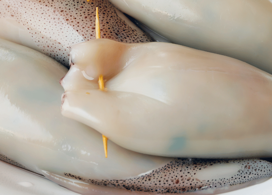 Recheie os tubos de lula com o recheio e prenda-os com um palito de madeira